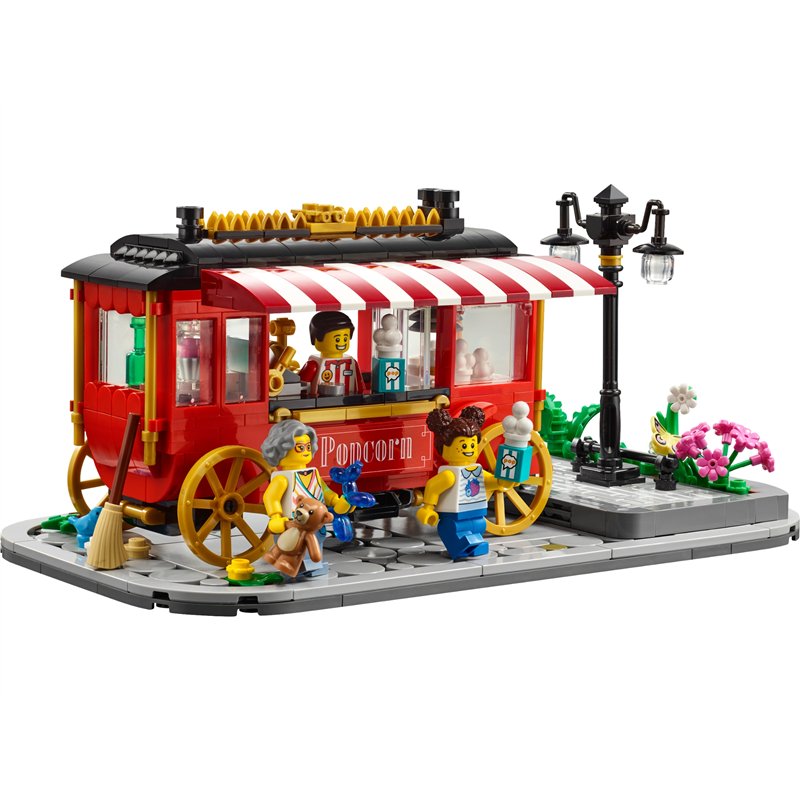 El vagón se coloca sobre una base de exhibición y se puede desmontar fácilmente para jugar. La base cuenta con un camino adoquinado, una acera, una lámpara y flores brillantes. ¡Los amantes de los animales seguro que notarán un pájaro y una mariposa acercándose con curiosidad! El set incluye tres minifiguras: el dueño del vagón y una niña con su abuela.