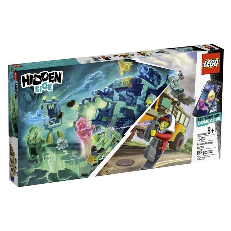 ¡Sumerge a tu peque en una experiencia de juego en realidad aumentada a toda velocidad con el set LEGO® Hidden Side™ Autobús de Intercepción (70423)! Descarga la app Hidden Side y escanea el modelo con un teléfono para que cobre vida: al interactuar con el modelo, suceden cosas en la app. Con las continuas actualizaciones y con un fantasma jefe diferente al que enfrentarse en cada set, nuevos misterios por resolver, objetos alucinantes por encontrar, misiones por cumplir y fantasmas por coleccionar… ¡este set LEGO Hidden Side ofrece a los niños una manera completamente nueva de jugar e interactuar con los ladrillos para construir! El hiperacelerado autobús escolar de juguete cuenta con alucinantes detalles tecnológicos, como un centro de control extraíble y cañones de juguete desplegables, que fomentan el juego creativo e invitan a pasarlo bien durante horas. Con las 2 minifiguras de los héroes, cada una con su propio smartphone, la genio de la tecnología J. B., 2 trabajadores embrujados y una figura de un simpático perro fantasma, este set de construcción inspira un montón de divertidas ideas de juego.